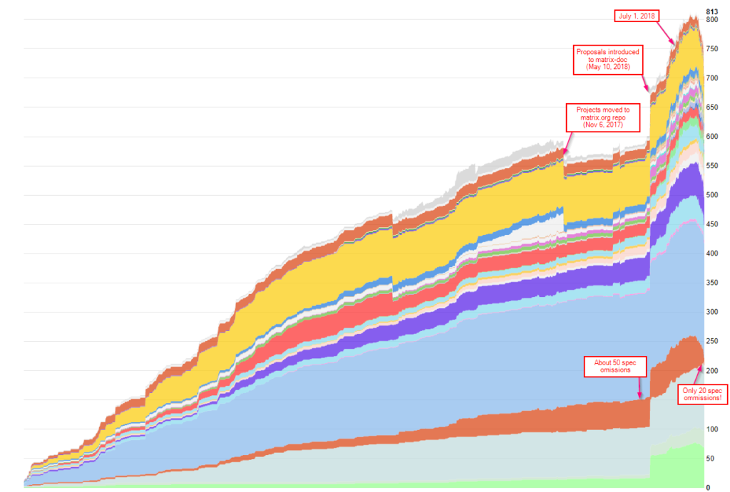 Anyway, enough numerology. It's worth noting that all of the dev for r0 has generally followed the proposed Open Governance Model for Matrix, with the core spec team made up of both historical core team folk (erik, richvdh, dave & matthew), new core team folk (uhoreg & travis) and community folk (kitsune, anoa & mujx) working together to review and approve the changes - and we've been doing MSCs (albeit with an accelerated pace) for anything which we feel requires input from the wider community. Once the Server/Server r0 release is out the door we'll be finalising the open governance model and switching to a slightly more measured (but productive!) model of spec development as outlined there.