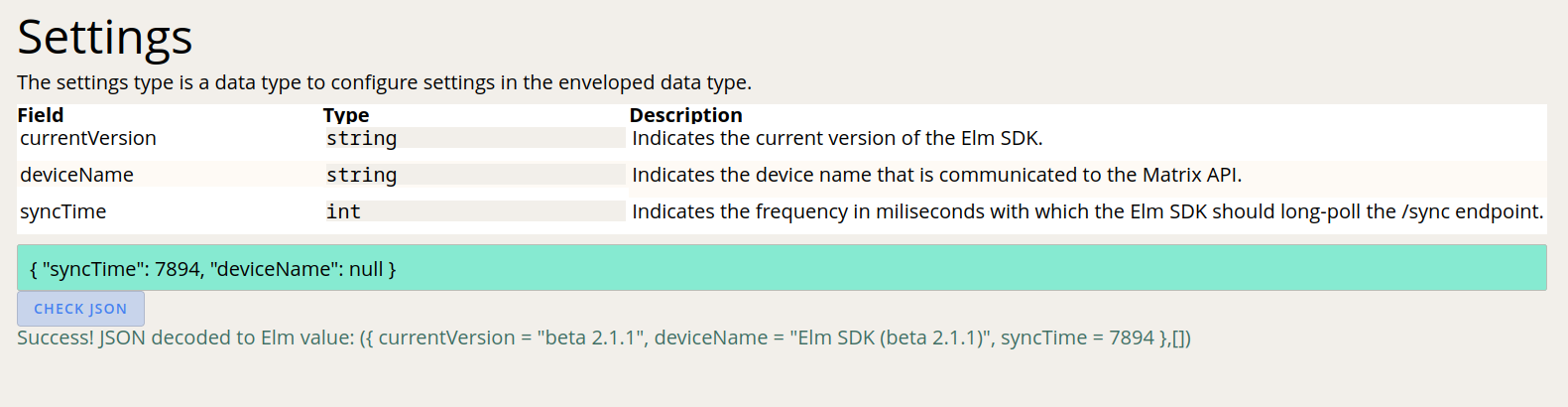 Because of the two-ways encoding, every Elm type contains a JSON checkers that helps you debug how and whether your JSON is properly decoded or not - so feel free to try it out for yourself!